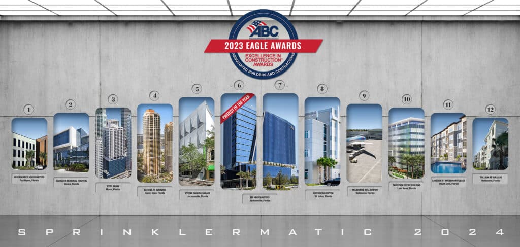 Sprinklermatic celebrates the distinction of being recognized with a total of 12 ABC Eagle Awards throughout the State of Florida including Project of the Year awarded by the Associated Builders and Contractors Central Florida Chapter, First Coast Chapter, East Coast Chapter and Gulf Coast Chapters.